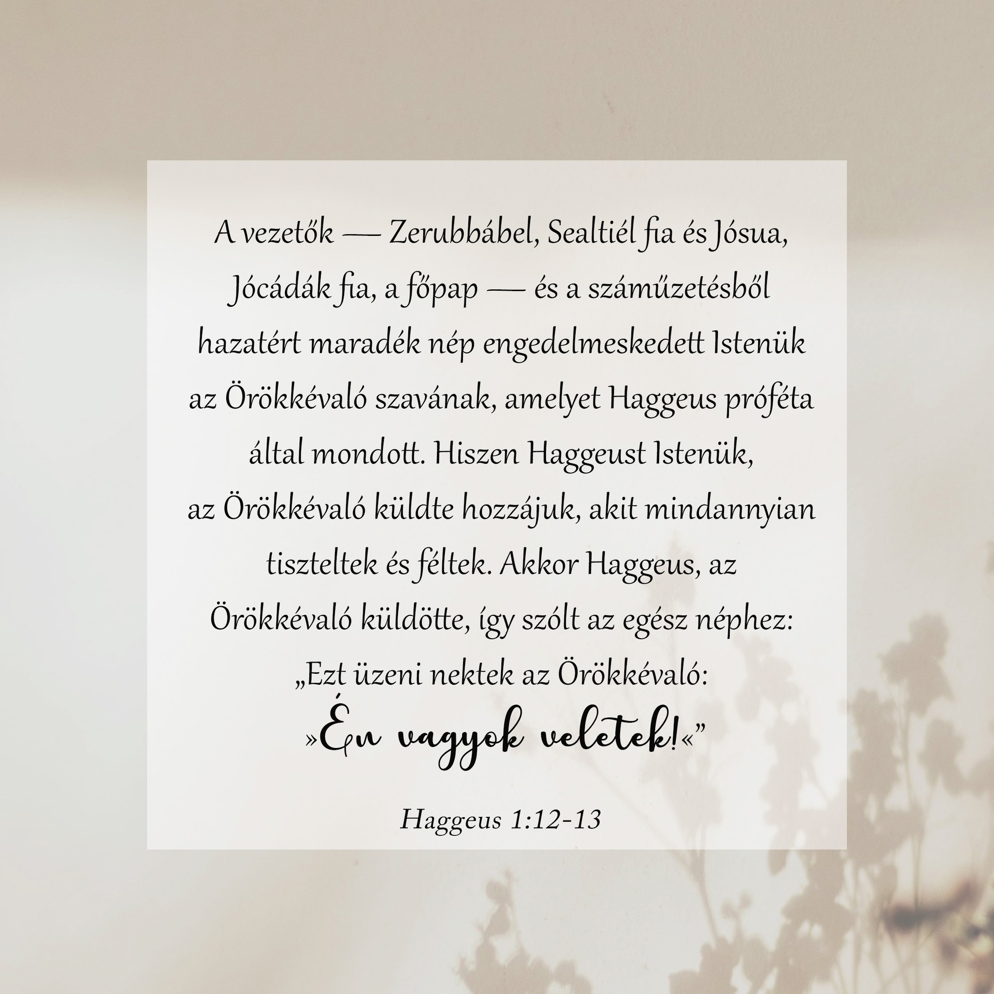 A vezetők - Zerubbábel, Sealtiél fia és Jósua, Jócádák fia, a főpap – és a számüzetésből hazatért maradék nép engedelmeskedett Istenük az Örökkévaló szavának, amelyet Haggeus próféta által mondott. Hiszen Haggeust Istenük az Örökkévaló küldte hozzájuk, akit mindannyian tiszteltek és féltek. .Akkor Haggeus, az örökkévaló küldötte, így szólt az egész néphez: „Ezt üzeni nektek az Örökkévaló: „Én vagyok veletek!“
