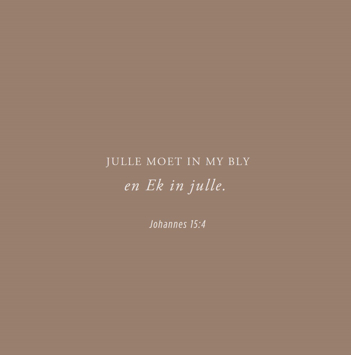 Julle moet in My bly en Ek in julle. 'n Loot kan nie uit sy eie vrugte dra as hy nie aan die wingerdstok bly nie; en so julle ook nie as julle nie in My bly nie.