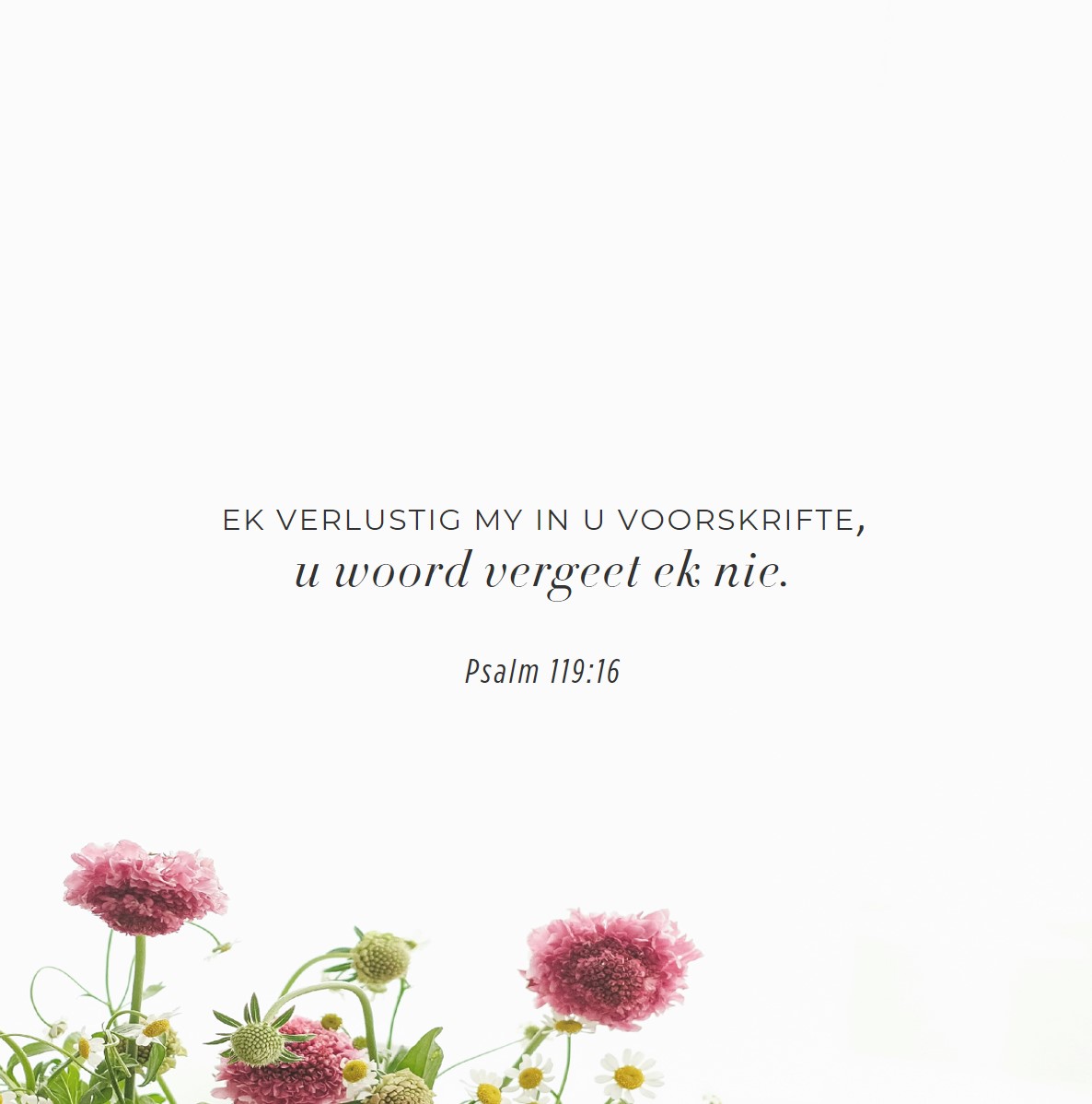 U bevele bly my altyd by. Ek gee ag op die pad wat U aanwys. Ek verlustig my in u voorskrifte, u woord vergeet ek nie.