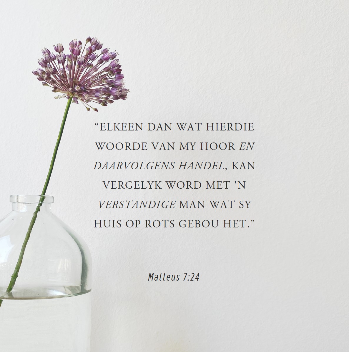 Elkeen dan wat hierdie woorde van My hoor en daarvolgens handel, kan vergelyk word met 'n verstandige man wat sy huis op rots gebou het. Die stortreën het geval, vloedwaters het afgekom, winde het teen daardie huis gewaai en daaraan geruk, en tog het dit nie ingestort nie, want die fondament was op rots.