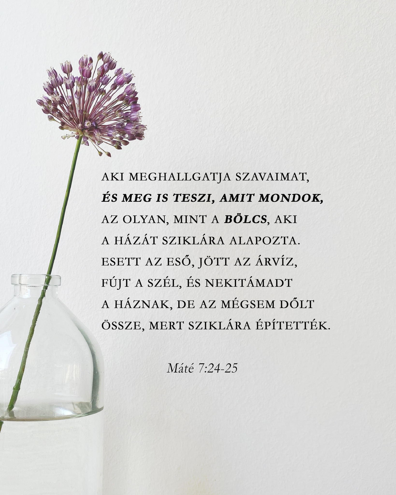 „Aki meghallgatja szavaimat, és meg is teszi, amit mondok, az olyan, mint a bölcs, aki a házát sziklára alapozta. Esett az eső, jött az árvíz, fújt a szél, és nekitámadt a háznak, de az mégsem dőlt össze, mert sziklára építették.”