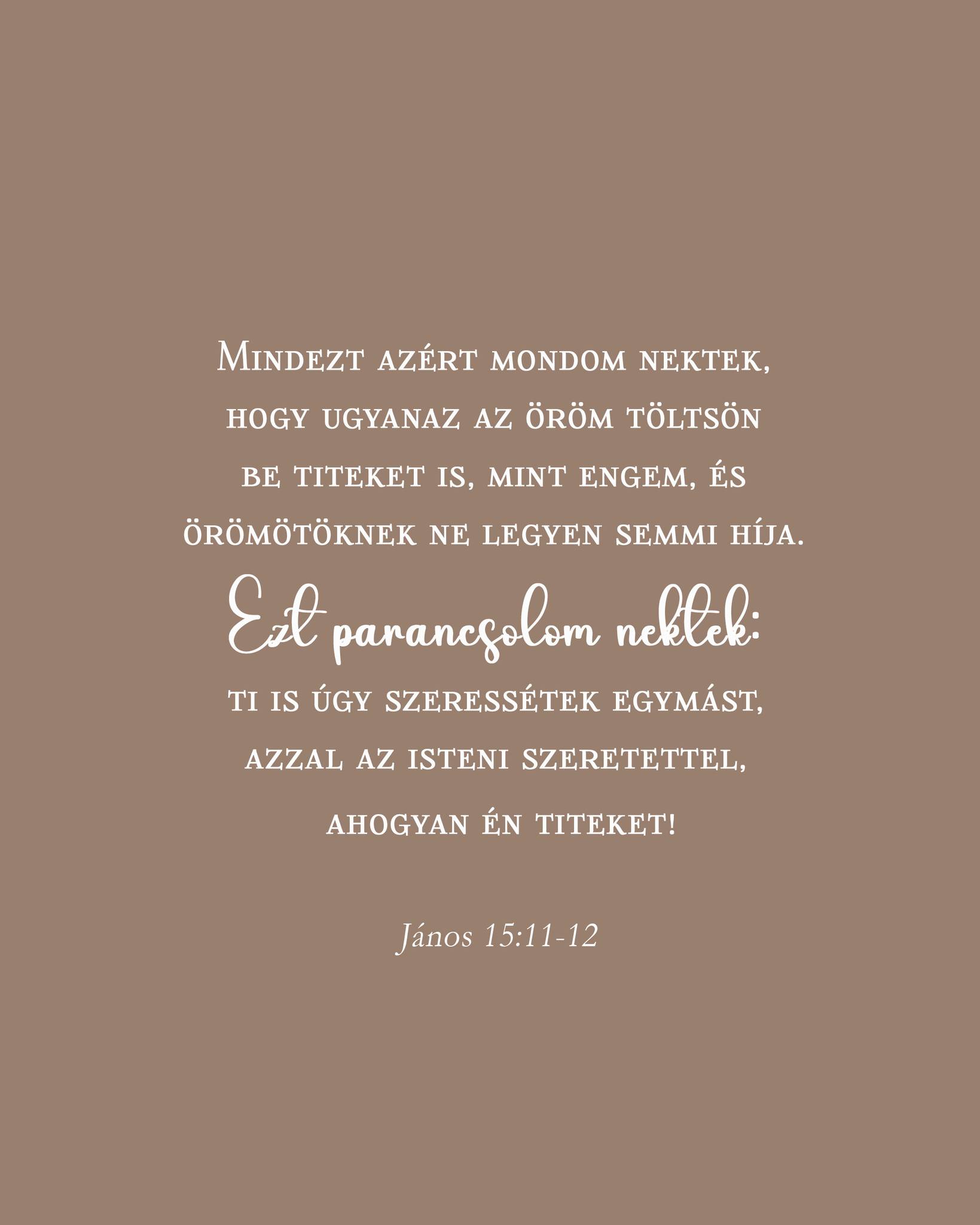 „Mindezt azért mondom nektek, hogy ugyanaz az öröm töltsön be titeket is, mint engem, és örömötöknek ne legyen semmi híja. Ezt parancsolom nektek: ti is úgy szeressétek egymást, azzal az isteni szeretettel, ahogyan én titeket!”