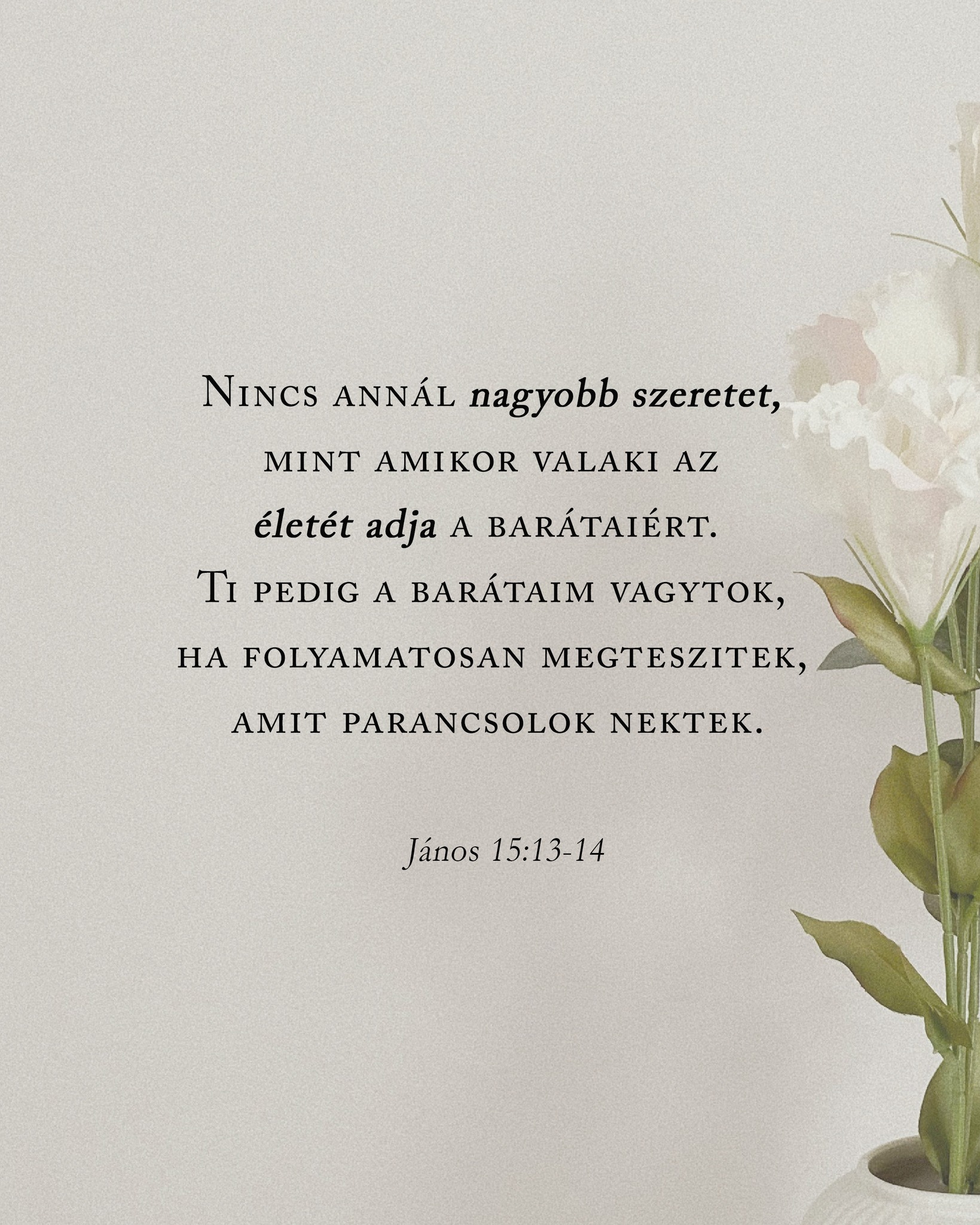 „Nincs annál nagyobb szeretet, mint amikor valaki az életét adja a barátaiért. Ti pedig a barátaim vagytok, ha folyamatosan megteszitek, amit parancsolok nektek.”