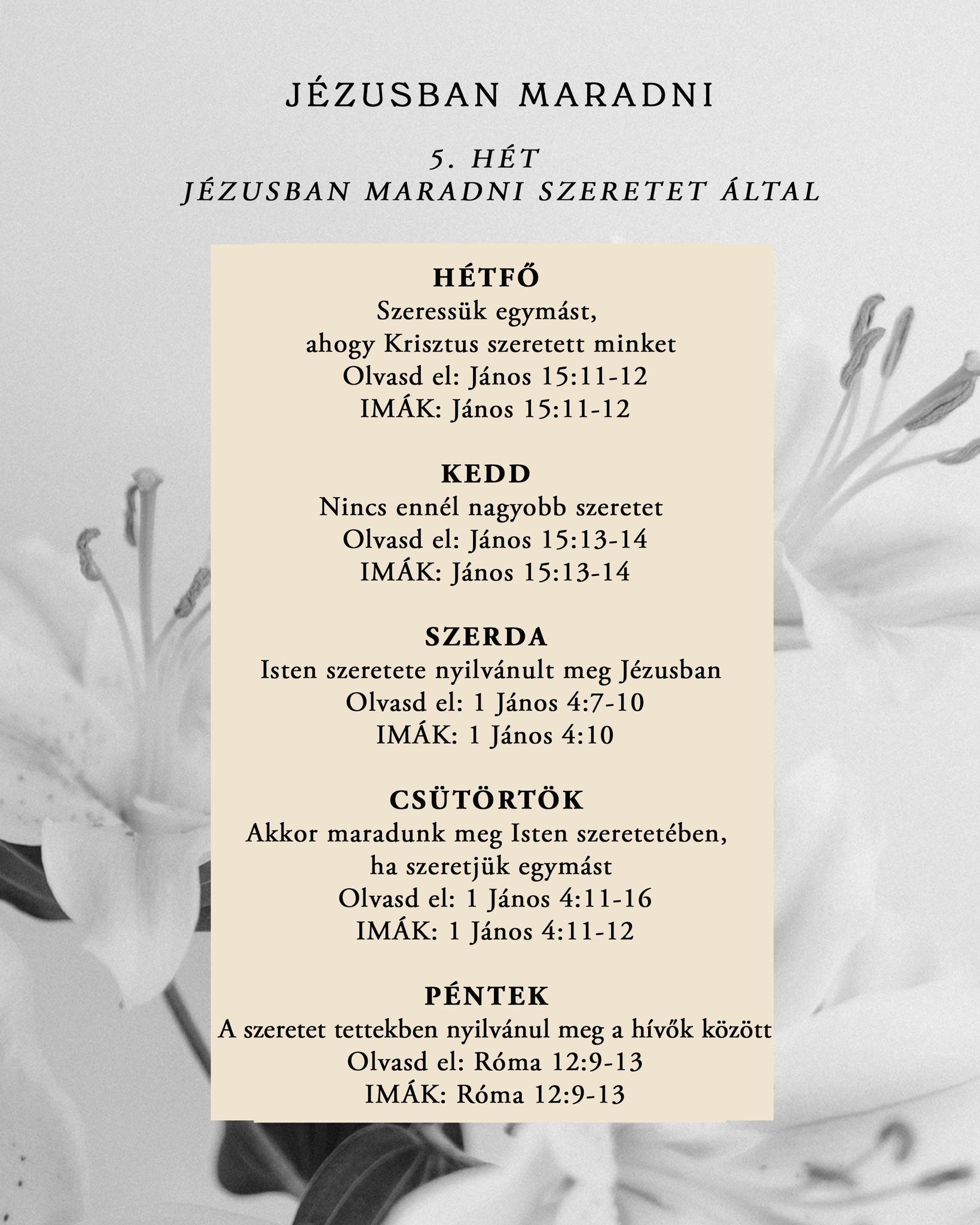 A tanulmány keretében egy hat hetes utazásra indulunk Jézus hívásának kellős közepébe, hogy megmaradjunk Őbenne. A tanulmányban megvizsgáljuk, mit jelent Jézusban maradni, naponta közel kerülni Hozzá és hagyni, hogy az Ő élete átjárja a miénket.
