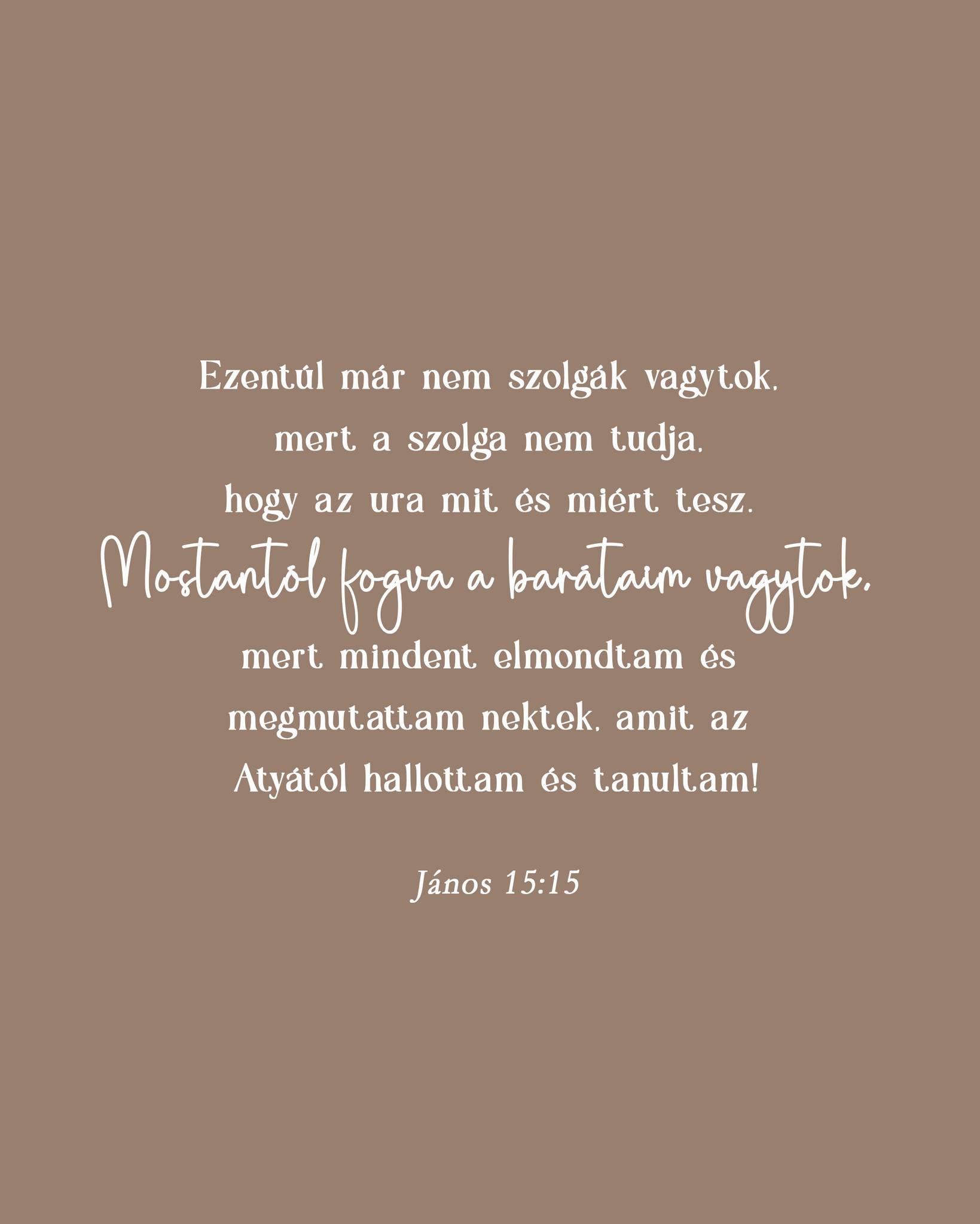 „Ezentúl már nem szolgák vagytok, mert a szolga nem tudja, hogy az ura mit és miért tesz. Mostantól fogva a barátaim vagytok, mert mindent elmondtam és megmutattam nektek, amit az Atyától hallottam és tanultam!”