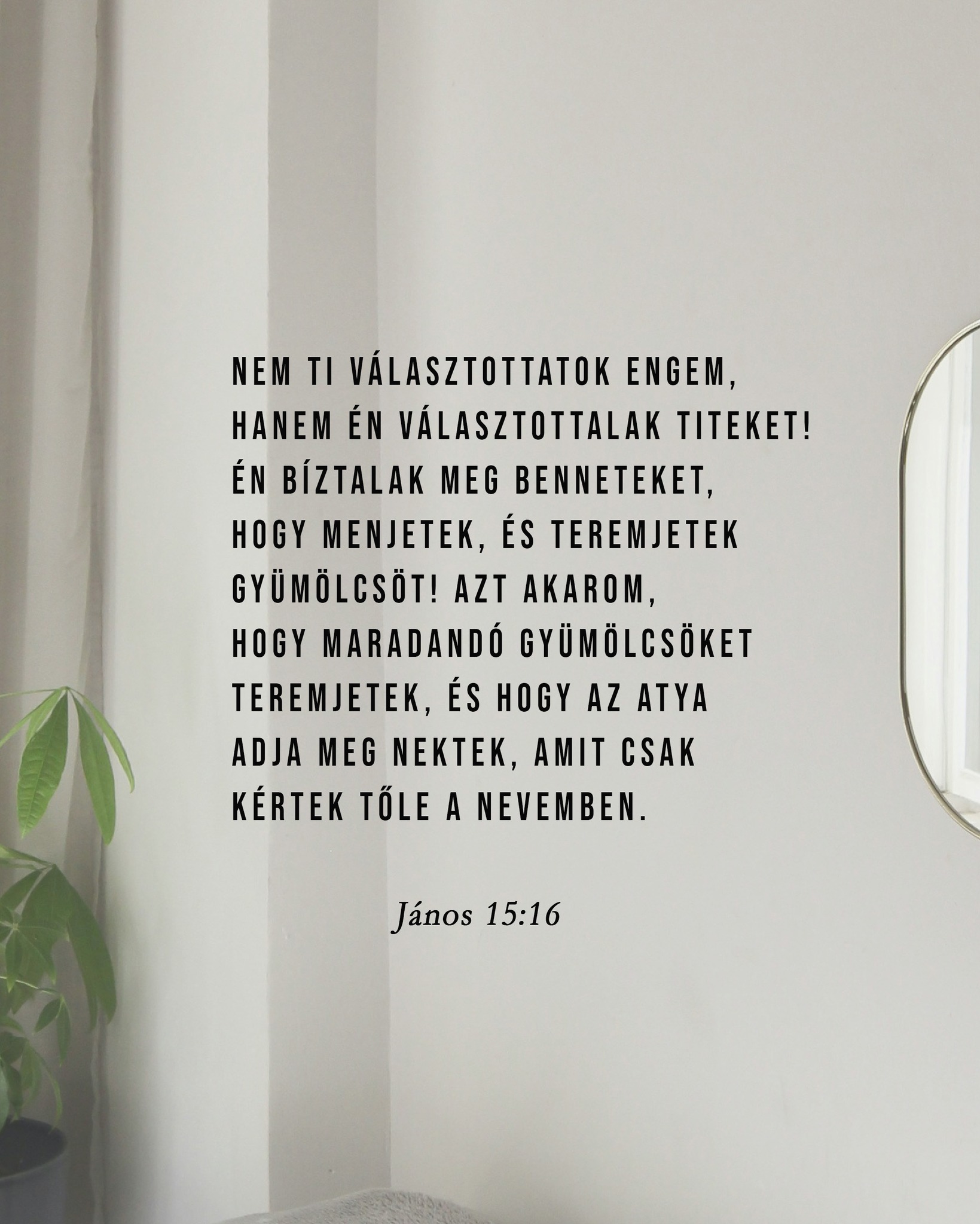 „Nem ti választottatok engem, hanem én választottalak titeket! Én bíztalak meg benneteket, hogy menjetek, és teremjetek gyümölcsöt! Azt akarom, hogy maradandó gyümölcsöket teremjetek, és hogy az Atya adja meg nektek, amit csak kértek tőle a nevemben.”