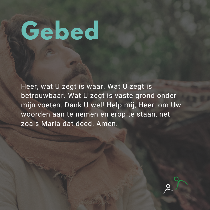 Heer, wat U zegt is waar. Wat U zegt is betrouwbaar. Wat U zegt is vaste grond onder mijn voeten. Dank U wel! Help mij, Heer, om Uw woorden aan te nemen en erop te staan, net zoals Maria dat deed. Amen.