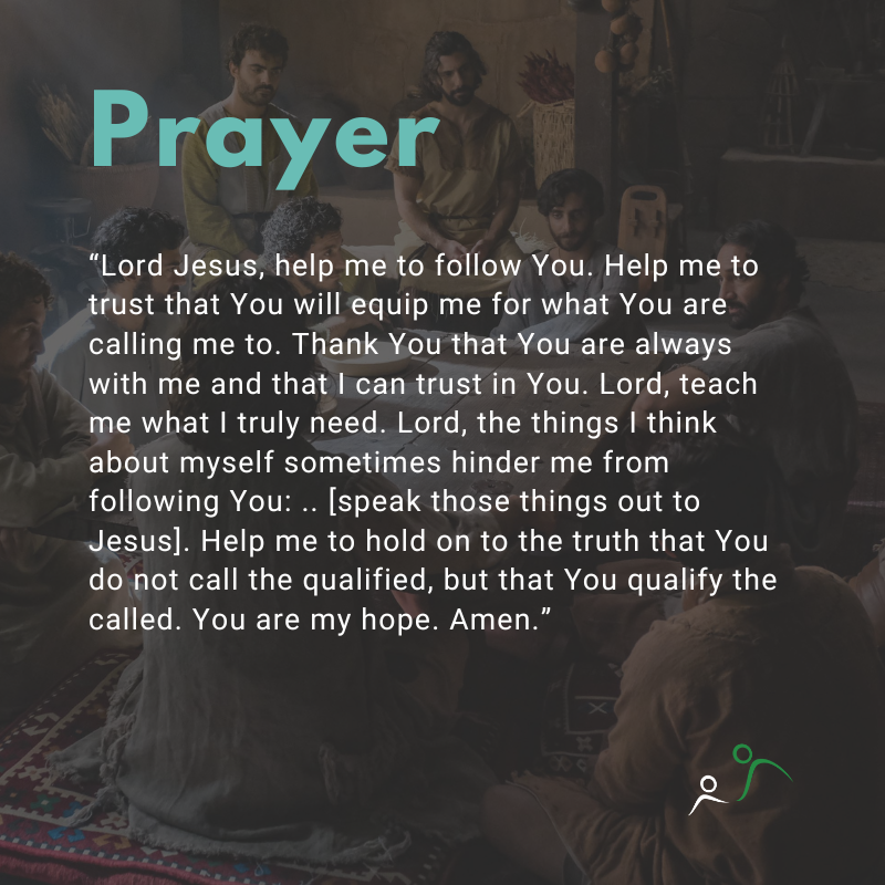 Prayer: “Lord Jesus, help me to follow You. Help me to trust that You will equip me for what You are calling me to. Thank You that You are always with me and that I can trust in You. Lord, teach me what I truly need. Lord, the things I think about myself sometimes hinder me from following You: .. [speak those things out to Jesus]. Help me to hold on to the truth that You do not call the qualified, but that You qualify the called. You are my hope. Amen.”