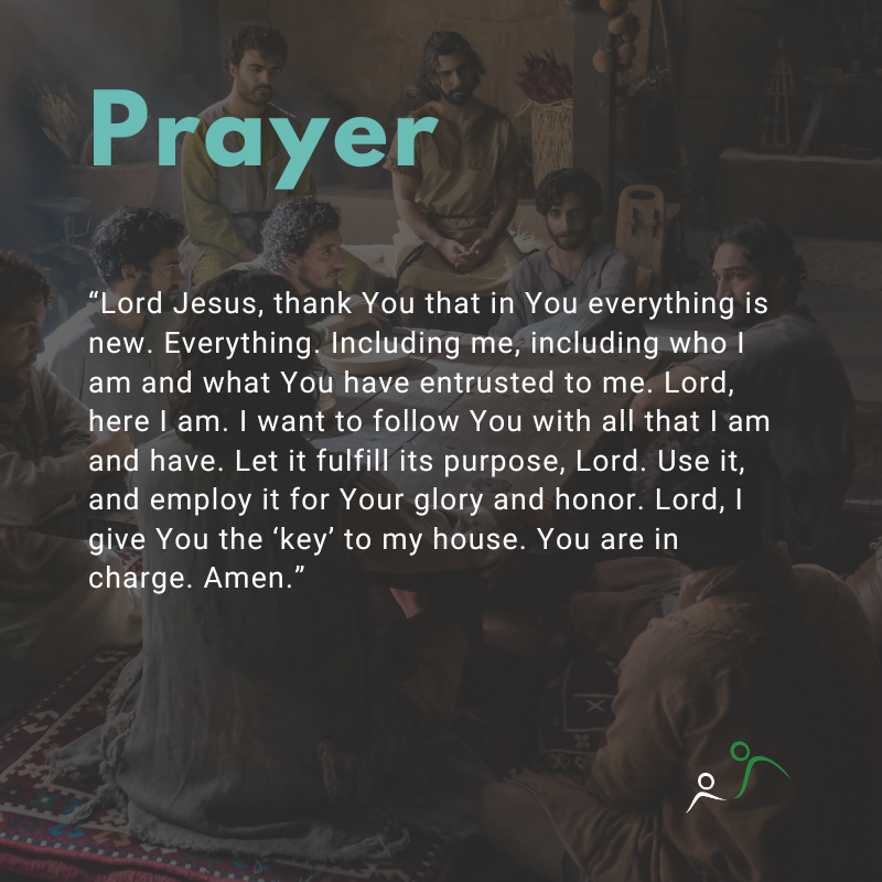 Prayer: “Lord Jesus, thank You that in You everything is new. Everything. Including me, including who I am and what You have entrusted to me. Lord, here I am. I want to follow You with all that I am and have. Let it fulfill its purpose, Lord. Use it, and employ it for Your glory and honor. Lord, I give You the ‘key’ to my house. You are in charge. Amen.”