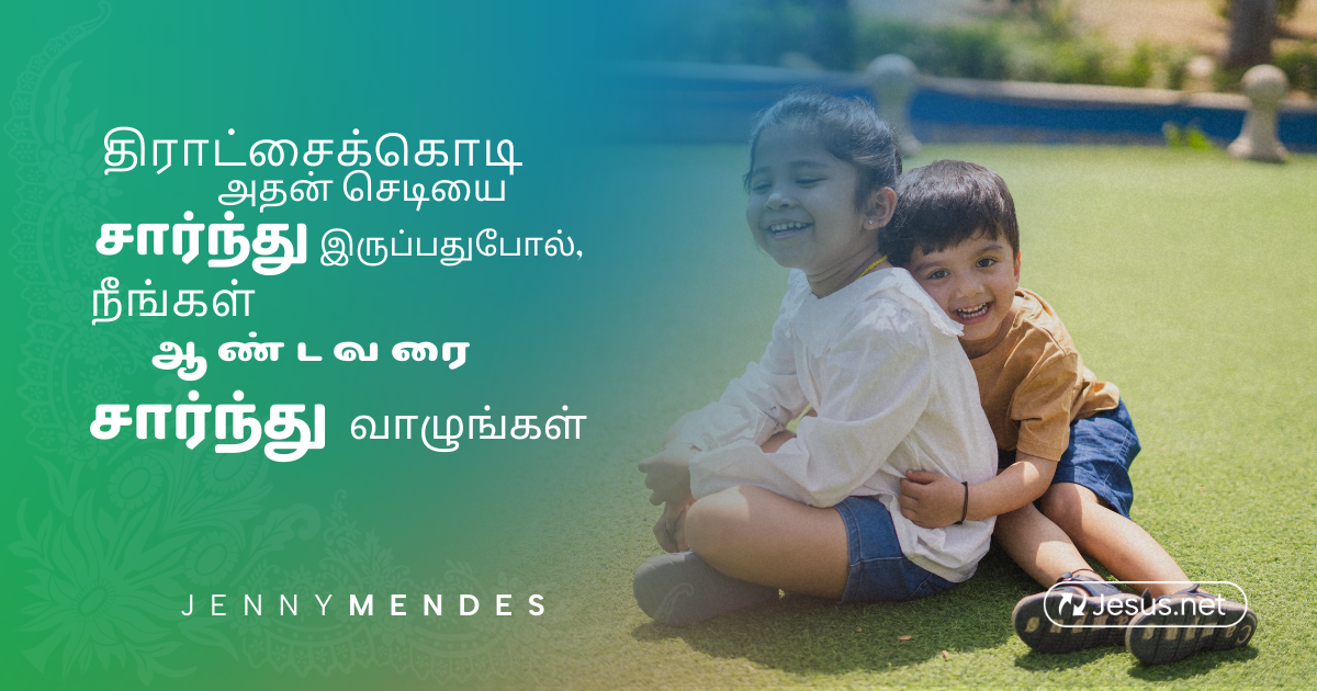 ஒரு கிளை அதன் செடியைச் சார்ந்திருப்பதுபோல, நீங்கள் ஆண்டவரைச் சார்ந்திருக்க வேண்டும் என்று அவர் விரும்புகிறார். நீங்கள் தொடர்ந்து இணைந்திருப்பதைத் தெரிந்துகொள்ளும்வரை, அவர் உங்களைப் போஷிப்பதாகவும், கவனித்துக்கொள்வதாகவும், உங்களைப் பராமரிப்பதாகவும் வாக்குப்பண்ணுகிறார்.