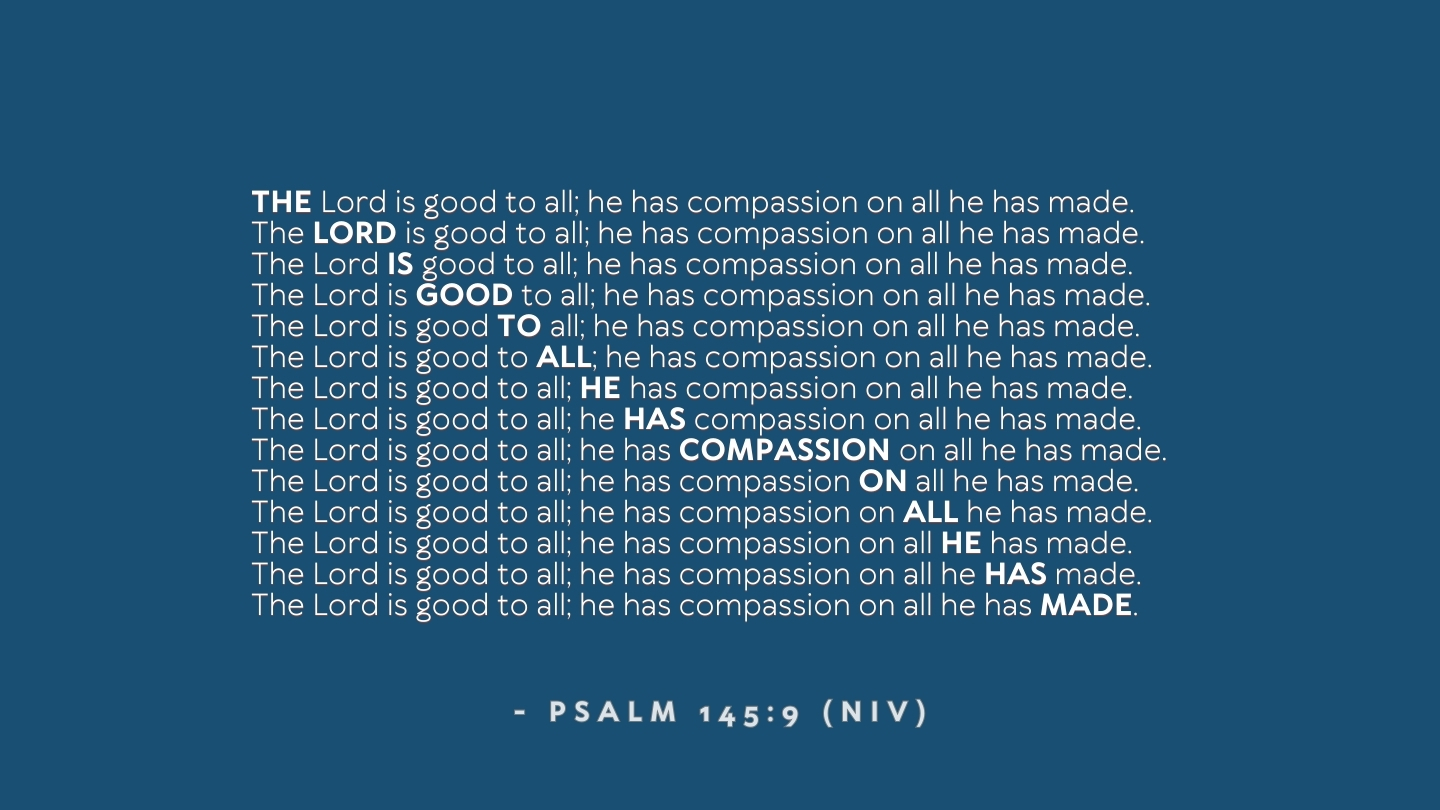 "The Lord is good to all; he has compassion on all he has made" (Psalm 145:9, NIV).
