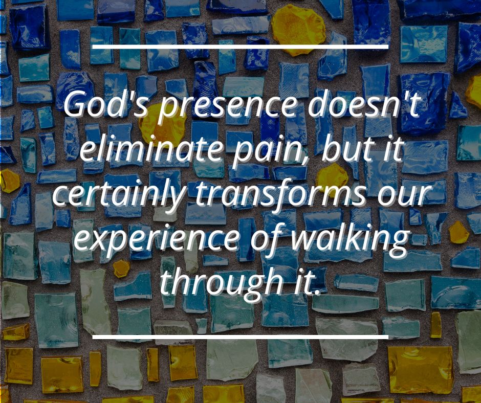 God's presence doesn't eliminate pain, but it indeed transforms our experience of walking through it. I encourage you today to remove any expectation that you should be "over this” by now. We serve a God who is patient and kind, who never leaves nor forsakes us. He's more patient with you than you are with yourself.