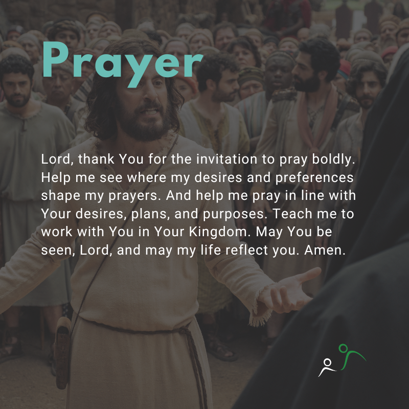 Lord, thank You for the invitation to pray boldly. Help me see where my desires and preferences shape my prayers. And help me pray in line with Your desires, plans, and purposes. Teach me to work with You in Your Kingdom. May You be seen, Lord, and may my life reflect you. Amen.