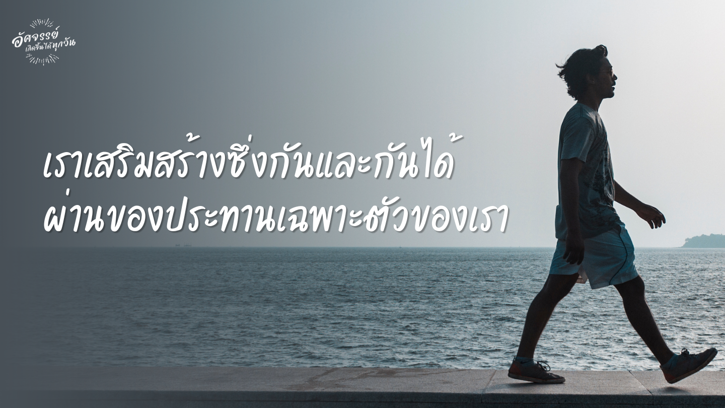 ด้วยพระคุณของพระองค์ พระเจ้าทรงมองเห็นแต่ไกลแล้วว่า เราจะเป็นครอบครัวใหญ่ที่ยอดเยี่ยม และเราสามารถสร้างเสริมซึ่งกันและกันได้ ผ่านของประทานเฉพาะตัวของเรา คุณก็เป็นส่วนหนึ่งของครอบครัวใหญ่นี้เช่นกัน คำอธิษฐานของฉันคือ ขอให้คุณสามารถค้นพบของประทานของคุณ และใช้มันเพื่อเสริมสร้างพระกายของพระคริสต์