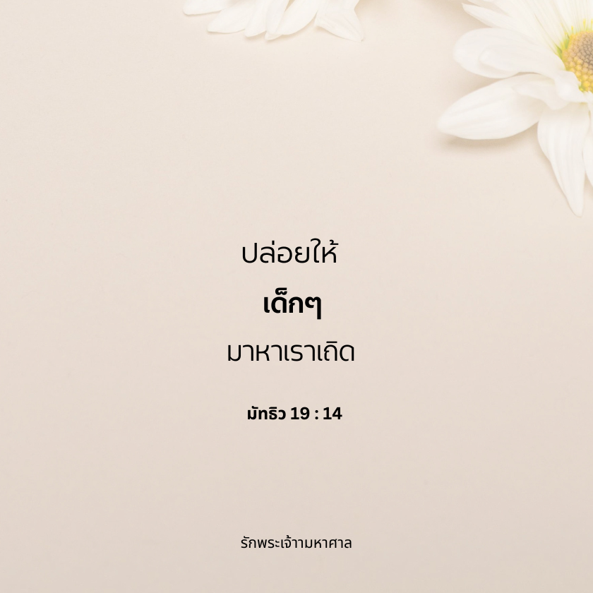 พระเยซูที่รัก ขอบพระคุณสำหรับแบบอย่างความรักและความอ่อนโยนต่อเด็กๆ โปรดช่วยให้ข้าพระองค์รวบรวมความรักและความอดทนเหมือนกับพระองค์ มองเห็นคุณค่าและความสำคัญของเด็กๆทุกคน และแสดงความรักของพระองค์ผ่านการกระทำและคำพูดของข้าพระองค์ อาเมน