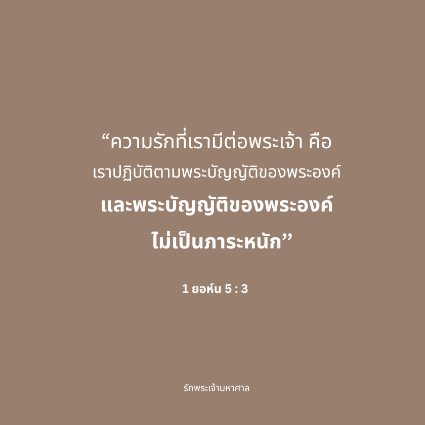 พี่น้องที่รัก เราถูกเรียกให้รักพระเจ้าทั้งชีวิตและด้วยทุกสิ่งที่เรามี เมื่อเราเลือกที่จะดำเนินชีวิตด้วยการเชื่อฟังพระเจ้านั่นแสดงถึงความรักที่เรามีต่อพระองค์ เป้าหมายคือ การเชื่อฟังที่เกิดจากความรัก เรารักเพราะพระเยซูทรงรักเราก่อน (1ยอห์น 4:19) เราสามารถถ่ายทอดชีวิตแห่งความรักให้กับลูกๆของเราได้ ซึ่งหมายถึง การยอมจำนนต่อพระคริสต์อย่างเต็มที่