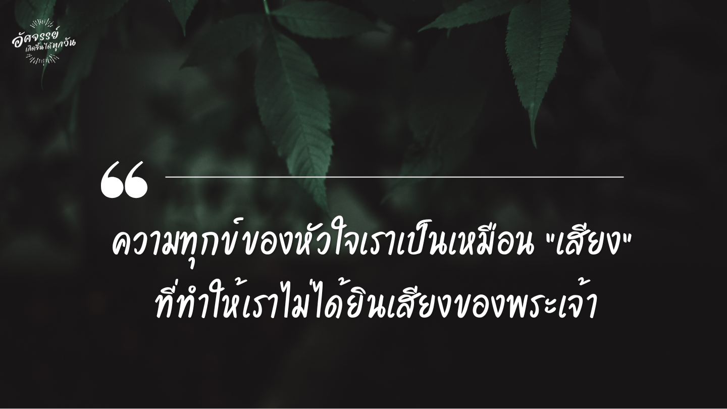 “สิ่งที่รบกวนหัวใจของเราก็รบกวนจิตวิญญาณของเราด้วย” ซาราห์ ฮอร์น กล่าวไว้ในหนังสือของเธอที่ชื่อว่า “แล้วฉันจะให้อภัยได้อย่างไร?” (How Can I Possibly Forgive?) บ่อยครั้ง ความทุกข์ของหัวใจเราเป็นเหมือน “เสียง” ที่ทำให้เราไม่ได้ยินเสียงของพระเจ้า และไม่ได้รับพระพรที่พระองค์ทรงประสงค์จะประทานให้เรา