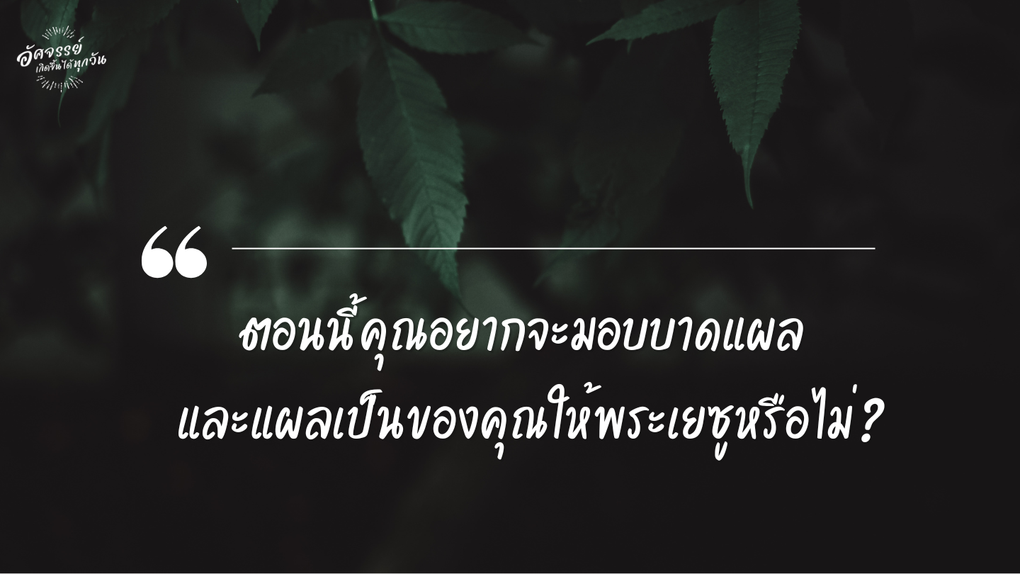 เนื้อเพลงนี้ยอดเยี่ยมมากใช่ไหมคะ ตอนนี้คุณอยากจะมอบบาดแผล และแผลเป็นของคุณให้พระเยซูหรือไม่? ถ้าเป็นเช่นนั้น ฉันขอเชิญคุณมาอธิษฐานด้วย “พระเยซู ลูกเลือกที่จะมอบแผลเป็นของลูกให้พระองค์ในตอนนี้ ลูกเชื่อว่าพระองค์จะทรงใช้บาดแผลนี้ เพื่อพระเกียรติของอันยิ่งใหญ่ของพระองค์ ลูกวางใจในพระองค์ และลูกเชื่อว่าพระองค์จะทรงฟื้นฟูและรักษาลูก เอเมน”