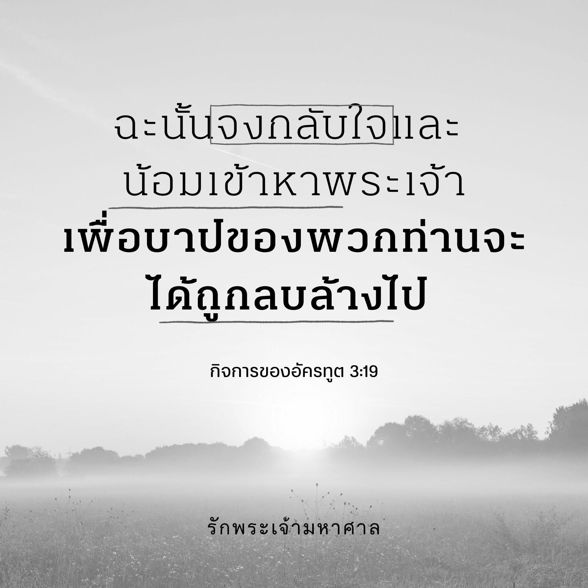 พระเยซูที่รัก ขอบคุณสำหรับความอดทนของพระองค์ และความปรารถนาที่จะให้ข้าพระองค์กลับใจ ช่วยข้าพระองค์หันหลังให้กับบาปและหันมาหาพระองค์ ขอพระองค์โปรดให้อภัย ชำระ และฟื้นฟูความสัมพันธ์ของข้าพระองค์กับพระองค์ ขอให้ชีวิตของข้าพระองค์เต็มไปด้วยการกลับใจและการเปลี่ยนแปลงอย่างต่อเนื่อง อธิษฐานในพระนามของพระองค์ อาเมน