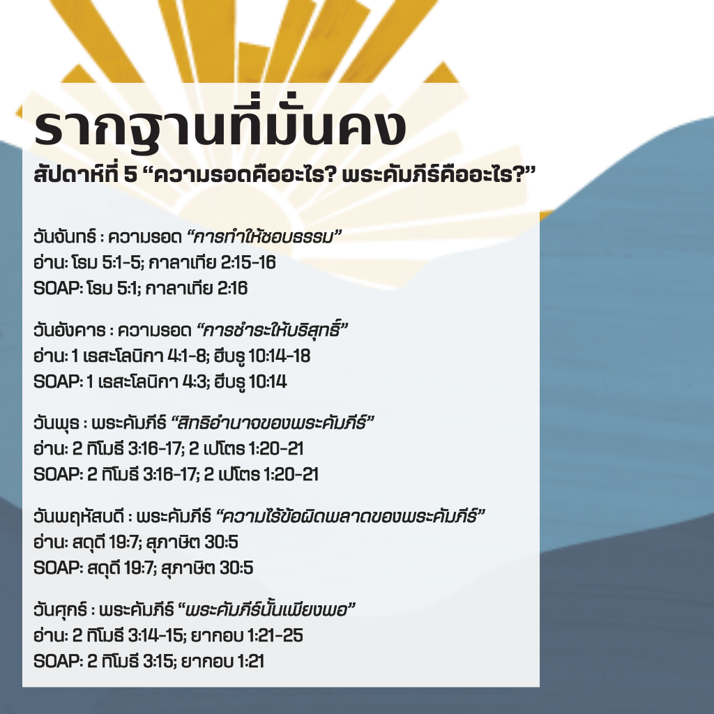 - ทำไมพระคัมภีร์จึงเป็นสิทธิอำนาจสูงสุดสำหรับคริสเตียน? คุณจะสามารถเพิ่มเวลาสำหรับพระวจนะของพระเจ้าในกิจวัตรประจำวันของคุณได้อย่างไร? คุณจะทำอะไรเป็นขั้นตอนเฉพาะเพื่อให้สิ่งนี้เป็นสิ่งสำคัญในชีวิตของคุณ?