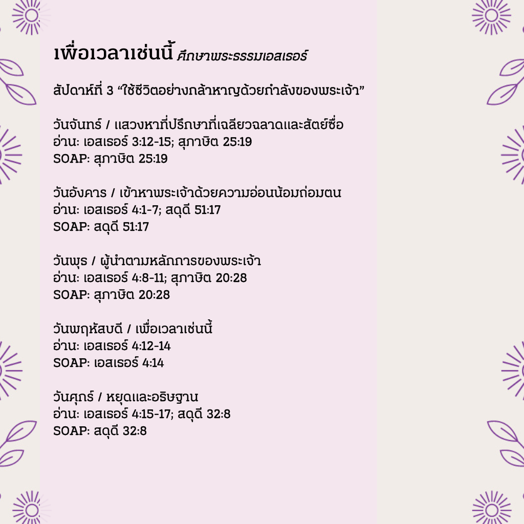 ในโลกที่ท้าทายความเชื่อของเราวันแล้ววันเล่า การเข้มแข็ง กล้าหาญ และลุกขึ้นยืนหยัดเพื่อสิ่งที่ถูกต้องเป็นสิ่งที่สำคัญยิ่งกว่าที่เคย แม้ว่าพระเจ้าจะไม่ถูกเอ่ยถึงในพระธรรมเอสเธอร์ แต่ลายนิ้วมือของพระองค์ปรากฏอยู่ทั่วเรื่องราวความจริงนี้ เอสเธอร์เป็นเรื่องราวเหนือกาลเวลา ที่เกี่ยวข้องกับชีวิตของเราในปัจจุบันเช่นเดียวกับชาวยิวที่ได้ประสบเหตุการณ์เหล่านี้มาแล้ว เป็นเรื่องราวเกี่ยวกับวิธีที่พระเจ้านำเด็กหญิงกำพร้าธรรมดาๆ คนหนึ่งขึ้นเป็นราชินีของประเทศที่ทรงอำนาจมากที่สุดในสมัยนั้น เรื่องราวของเอสเธอร์เตือนใจเราว่า พระเจ้ากำลังทำงานอยู่เสมอ จากเรื่องนี้ เราเรียนรู้ว่า ไม่มีสิ่งที่เรียกว่า "บังเอิญ" แม้ว่าบางครั้งพระเจ้าอาจดูเหมือนอยู่ห่างไกล หรือแม้กระทั่งเหมือนไม่มีอยู่จริง แต่พระองค์ทรงอยู่ และพระองค์อยู่กับเราเสมอและกำลังทำงานในชีวิตของเรา "เพื่อเวลาเช่นนี้" เป็นเรื่องเกี่ยวกับการเลือกความเชื่อเหนือความกลัว และก้าวไปข้างหน้าด้วยการเชื่อฟัง ไม่ว่าจะต้องแลกด้วยอะไรก็ตาม เรื่องราวอันน่าทึ่งของ "คนธรรมดา" ที่กลายเป็น "คนสำคัญ" นี้ เหมาะสำหรับพวกเราทุกคน เป็นเรื่องราวเกี่ยวกับการเลือกที่จะกล้าหาญและทำสิ่งที่ถูกต้องท่ามกลางความไม่แน่นอน เราอาจไม่เห็นพระเจ้าทำงานในชีวิตของเราเสมอไป แต่เราเชื่อว่า พระองค์อยู่ในทุกรายละเอียด เช่นเดียวกับที่พระองค์อยู่กับเอสเธอร์