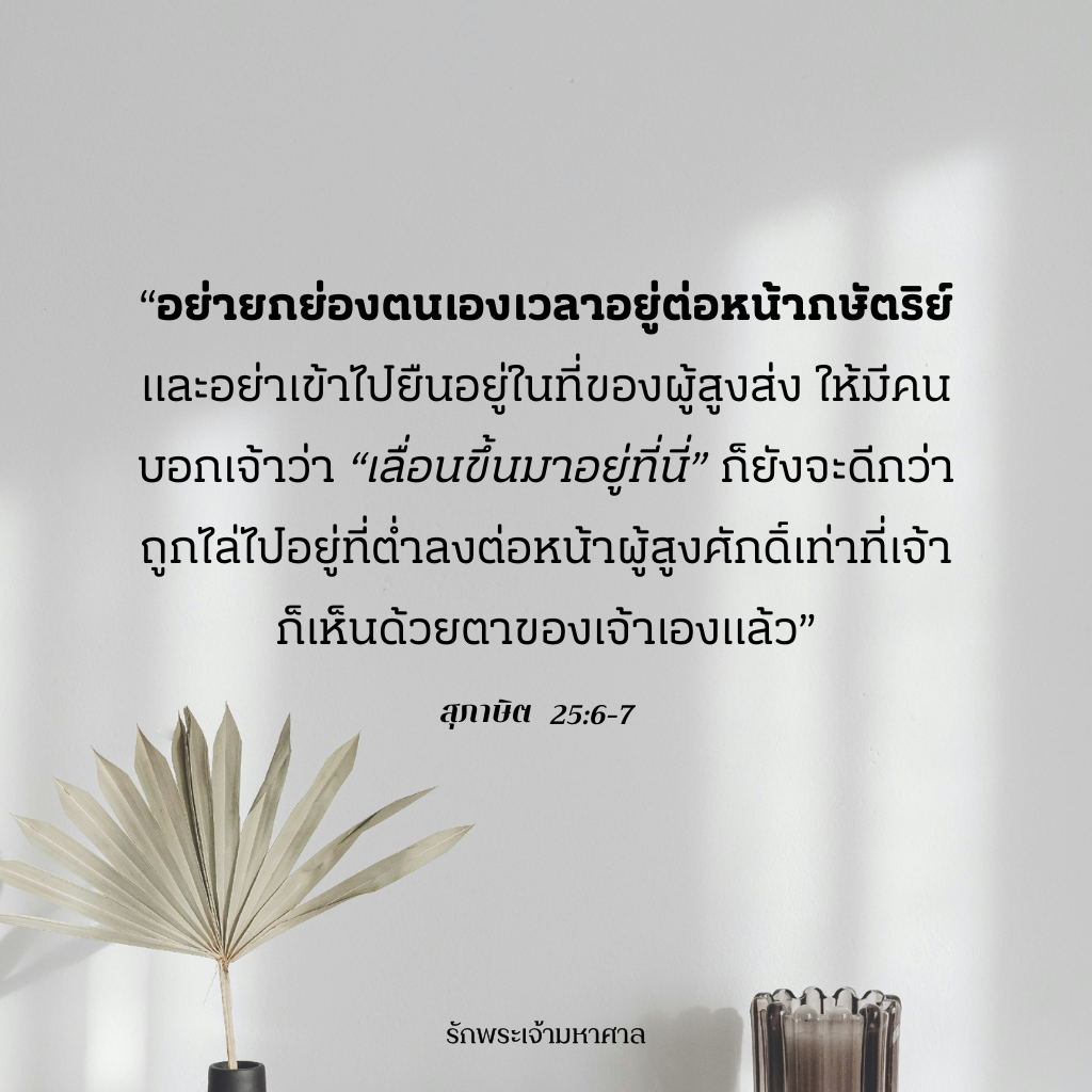 พระเยซูสอนหลักการนี้ไว้ใน ลูกาบทที่ 14 เมื่อพระองค์เล่าอุปมาเรื่อง การเลือกที่นั่งต่ำสุดในงานเลี้ยง เป็นการดีกว่าที่จะรับใช้อย่างเงียบๆ ในที่ที่เราอยู่ มากกว่าการแสวงหาเสียงปรบมือหรือตำแหน่ง เกียรติยศที่แท้จริงไม่ได้มาจากการยกย่องตัวเอง แต่มาจากการดำเนินชีวิตที่สะท้อนถึงความอ่อนน้อมถ่อมตนและความสัตย์ซื่อ เมื่อเราวางใจพระเจ้าให้เลื่อนฐานะเราในเวลาของพระองค์ เราจะพบกับความชื่นชมยินดีและสันติสุขที่ลึกซึ้งยิ่งขึ้น โดยรู้ว่า คุณค่าของเราไม่ได้ขึ้นอยู่กับการยอมรับของโลกนี้แต่ขึ้นอยู่กับความรักของพระเจ้าที่มีต่อเรา
