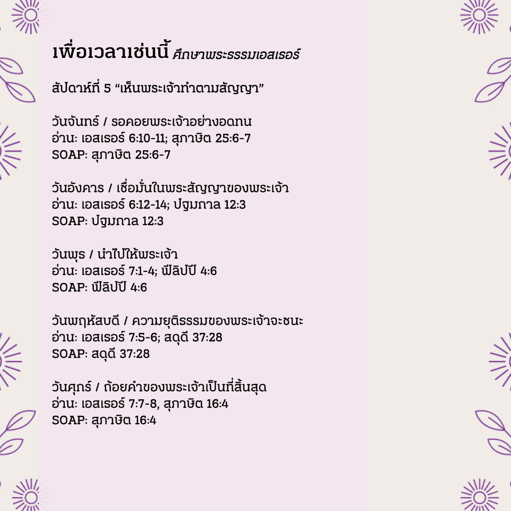 ในโลกที่ท้าทายความเชื่อของเราวันแล้ววันเล่า การเข้มแข็ง กล้าหาญ และลุกขึ้นยืนหยัดเพื่อสิ่งที่ถูกต้องเป็นสิ่งที่สำคัญยิ่งกว่าที่เคย แม้ว่าพระเจ้าจะไม่ถูกเอ่ยถึงในพระธรรมเอสเธอร์ แต่ลายนิ้วมือของพระองค์ปรากฏอยู่ทั่วเรื่องราวความจริงนี้ เอสเธอร์เป็นเรื่องราวเหนือกาลเวลา ที่เกี่ยวข้องกับชีวิตของเราในปัจจุบันเช่นเดียวกับชาวยิวที่ได้ประสบเหตุการณ์เหล่านี้มาแล้ว เป็นเรื่องราวเกี่ยวกับวิธีที่พระเจ้านำเด็กหญิงกำพร้าธรรมดาๆ คนหนึ่งขึ้นเป็นราชินีของประเทศที่ทรงอำนาจมากที่สุดในสมัยนั้น เรื่องราวของเอสเธอร์เตือนใจเราว่า พระเจ้ากำลังทำงานอยู่เสมอ จากเรื่องนี้ เราเรียนรู้ว่า ไม่มีสิ่งที่เรียกว่า "บังเอิญ" แม้ว่าบางครั้งพระเจ้าอาจดูเหมือนอยู่ห่างไกล หรือแม้กระทั่งเหมือนไม่มีอยู่จริง แต่พระองค์ทรงอยู่ และพระองค์อยู่กับเราเสมอและกำลังทำงานในชีวิตของเรา "เพื่อเวลาเช่นนี้" เป็นเรื่องเกี่ยวกับการเลือกความเชื่อเหนือความกลัว และก้าวไปข้างหน้าด้วยการเชื่อฟัง ไม่ว่าจะต้องแลกด้วยอะไรก็ตาม เรื่องราวอันน่าทึ่งของ "คนธรรมดา" ที่กลายเป็น "คนสำคัญ" นี้ เหมาะสำหรับพวกเราทุกคน เป็นเรื่องราวเกี่ยวกับการเลือกที่จะกล้าหาญและทำสิ่งที่ถูกต้องท่ามกลางความไม่แน่นอน เราอาจไม่เห็นพระเจ้าทำงานในชีวิตของเราเสมอไป แต่เราเชื่อว่า พระองค์อยู่ในทุกรายละเอียด เช่นเดียวกับที่พระองค์อยู่กับเอสเธอร์