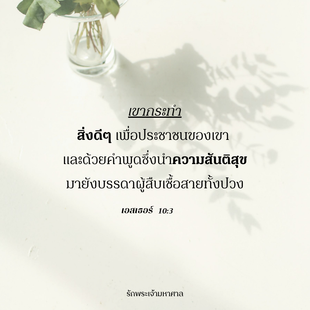 เพื่อนรัก พระเจ้ากำลังเรียกคุณให้ทำงานเพื่อคนของพระองค์ในที่ใด? มีใครในชีวิตของคุณหรือไม่ที่ต้องการกำลังใจ? มีใครที่ต้องการเสียงของคุณเพื่อเป็นกระบอกเสียงให้พวกเขาหรือเปล่า? เช่นเดียวกับโมร์เดคัย เราถูกเรียกให้แสวงหาความดีเพื่อผู้อื่น ไม่ใช่เพื่อผลประโยชน์ส่วนตัว แต่ด้วยความรักและการเชื่อฟังพระเจ้า เมื่อเรารับใช้ด้วยใจที่ถ่อม พระเจ้าเห็นความสัตย์ซื่อของเรา และพระองค์จะยกย่องเราในเวลาอันสมควรของพระองค์