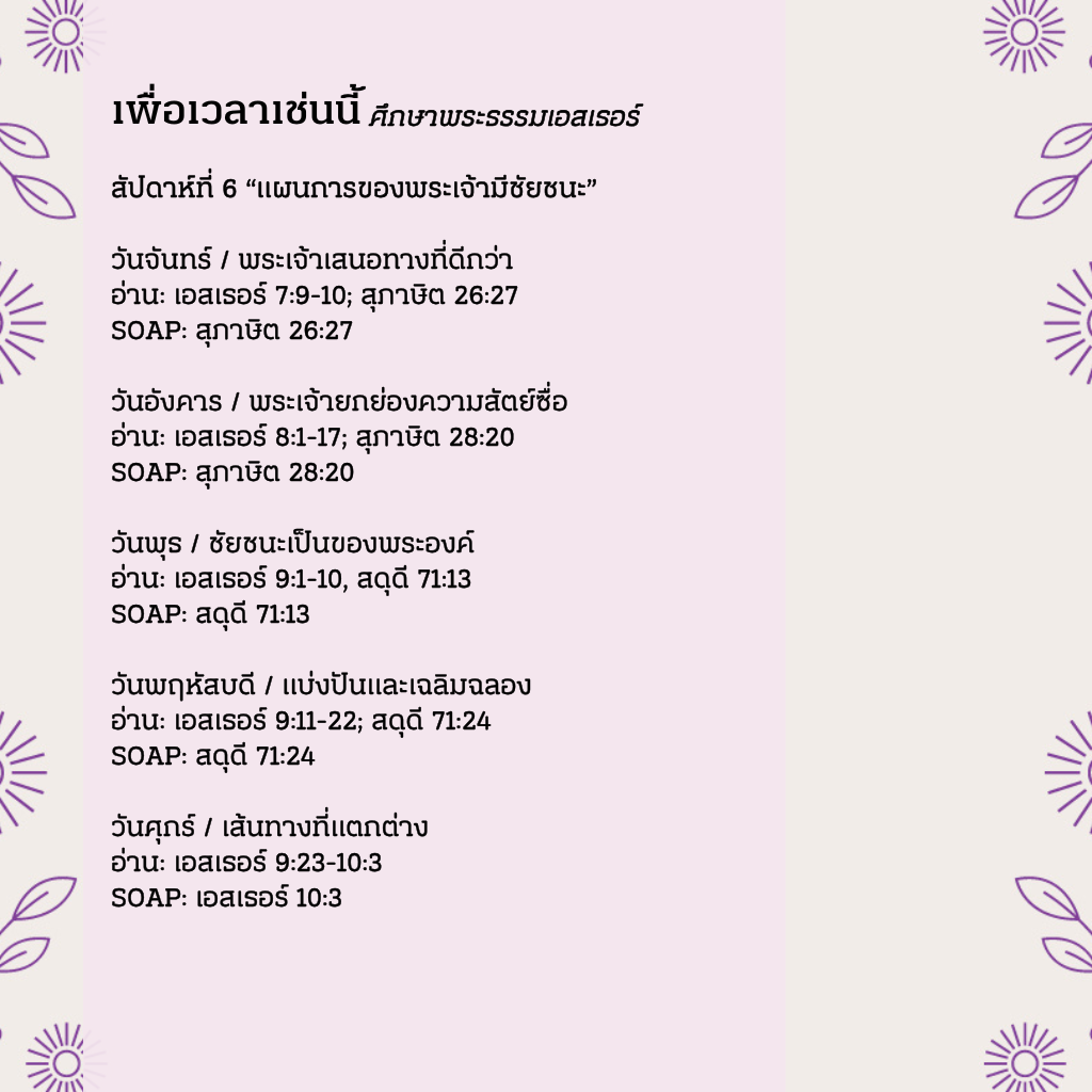 ในโลกที่ท้าทายความเชื่อของเราวันแล้ววันเล่า การเข้มแข็ง กล้าหาญ และลุกขึ้นยืนหยัดเพื่อสิ่งที่ถูกต้องเป็นสิ่งที่สำคัญยิ่งกว่าที่เคย แม้ว่าพระเจ้าจะไม่ถูกเอ่ยถึงในพระธรรมเอสเธอร์ แต่ลายนิ้วมือของพระองค์ปรากฏอยู่ทั่วเรื่องราวความจริงนี้ เอสเธอร์เป็นเรื่องราวเหนือกาลเวลา ที่เกี่ยวข้องกับชีวิตของเราในปัจจุบันเช่นเดียวกับชาวยิวที่ได้ประสบเหตุการณ์เหล่านี้มาแล้ว เป็นเรื่องราวเกี่ยวกับวิธีที่พระเจ้านำเด็กหญิงกำพร้าธรรมดาๆ คนหนึ่งขึ้นเป็นราชินีของประเทศที่ทรงอำนาจมากที่สุดในสมัยนั้น เรื่องราวของเอสเธอร์เตือนใจเราว่า พระเจ้ากำลังทำงานอยู่เสมอ จากเรื่องนี้ เราเรียนรู้ว่า ไม่มีสิ่งที่เรียกว่า "บังเอิญ" แม้ว่าบางครั้งพระเจ้าอาจดูเหมือนอยู่ห่างไกล หรือแม้กระทั่งเหมือนไม่มีอยู่จริง แต่พระองค์ทรงอยู่ และพระองค์อยู่กับเราเสมอและกำลังทำงานในชีวิตของเรา "เพื่อเวลาเช่นนี้" เป็นเรื่องเกี่ยวกับการเลือกความเชื่อเหนือความกลัว และก้าวไปข้างหน้าด้วยการเชื่อฟัง ไม่ว่าจะต้องแลกด้วยอะไรก็ตาม เรื่องราวอันน่าทึ่งของ "คนธรรมดา" ที่กลายเป็น "คนสำคัญ" นี้ เหมาะสำหรับพวกเราทุกคน เป็นเรื่องราวเกี่ยวกับการเลือกที่จะกล้าหาญและทำสิ่งที่ถูกต้องท่ามกลางความไม่แน่นอน เราอาจไม่เห็นพระเจ้าทำงานในชีวิตของเราเสมอไป แต่เราเชื่อว่า พระองค์อยู่ในทุกรายละเอียด เช่นเดียวกับที่พระองค์อยู่กับเอสเธอร์