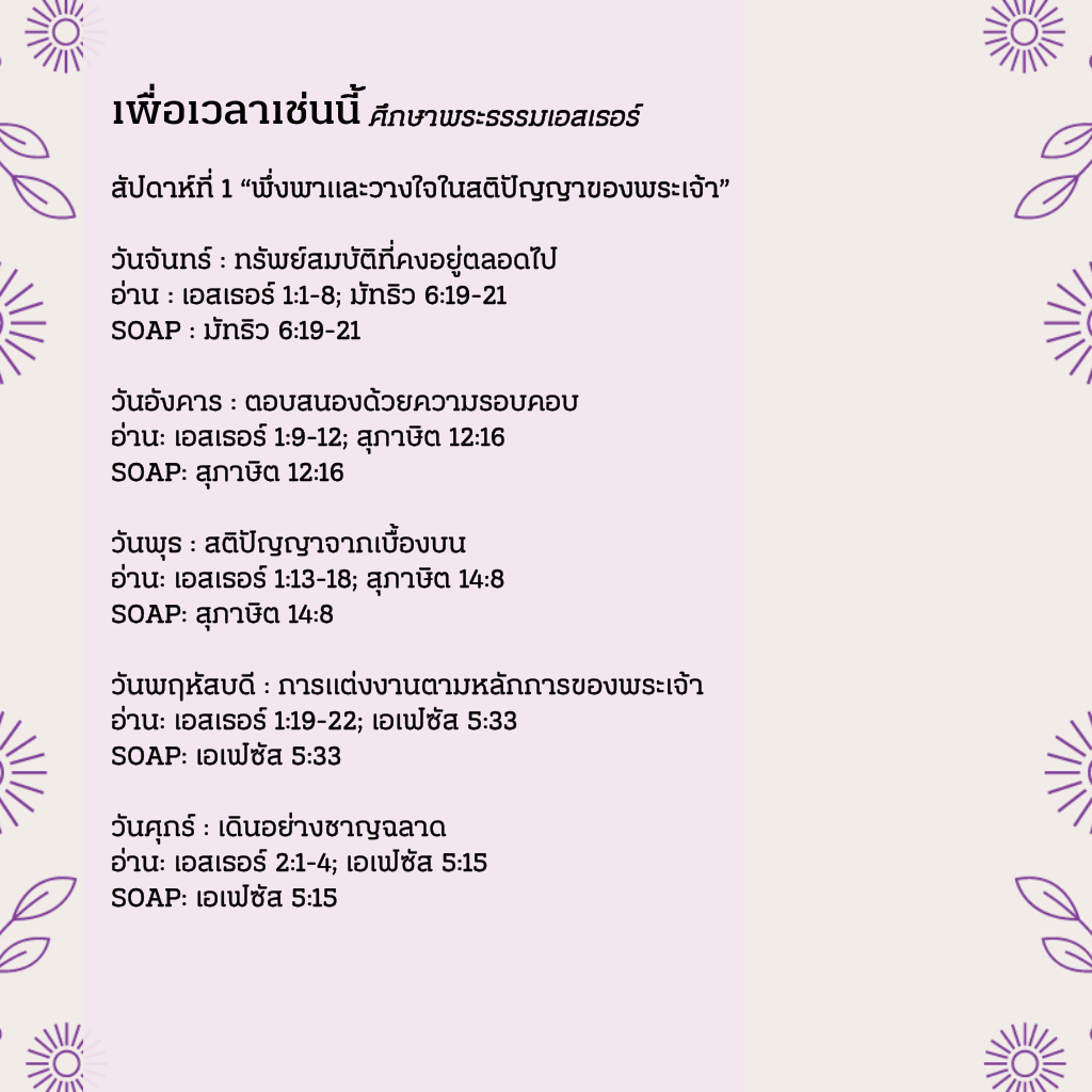 ในโลกที่ท้าทายความเชื่อของเราวันแล้ววันเล่า การเข้มแข็ง กล้าหาญ และลุกขึ้นยืนหยัดเพื่อสิ่งที่ถูกต้องเป็นสิ่งที่สำคัญยิ่งกว่าที่เคย แม้ว่าพระเจ้าจะไม่ถูกเอ่ยถึงในพระธรรมเอสเธอร์ แต่ลายนิ้วมือของพระองค์ปรากฏอยู่ทั่วเรื่องราวความจริงนี้ เอสเธอร์เป็นเรื่องราวเหนือกาลเวลา ที่เกี่ยวข้องกับชีวิตของเราในปัจจุบันเช่นเดียวกับชาวยิวที่ได้ประสบเหตุการณ์เหล่านี้มาแล้ว เป็นเรื่องราวเกี่ยวกับวิธีที่พระเจ้านำเด็กหญิงกำพร้าธรรมดาๆ คนหนึ่งขึ้นเป็นราชินีของประเทศที่ทรงอำนาจมากที่สุดในสมัยนั้น เรื่องราวของเอสเธอร์เตือนใจเราว่า พระเจ้ากำลังทำงานอยู่เสมอ จากเรื่องนี้ เราเรียนรู้ว่า ไม่มีสิ่งที่เรียกว่า "บังเอิญ" แม้ว่าบางครั้งพระเจ้าอาจดูเหมือนอยู่ห่างไกล หรือแม้กระทั่งเหมือนไม่มีอยู่จริง แต่พระองค์ทรงอยู่ และพระองค์อยู่กับเราเสมอและกำลังทำงานในชีวิตของเรา "เพื่อเวลาเช่นนี้" เป็นเรื่องเกี่ยวกับการเลือกความเชื่อเหนือความกลัว และก้าวไปข้างหน้าด้วยการเชื่อฟัง ไม่ว่าจะต้องแลกด้วยอะไรก็ตาม เรื่องราวอันน่าทึ่งของ "คนธรรมดา" ที่กลายเป็น "คนสำคัญ" นี้ เหมาะสำหรับพวกเราทุกคน เป็นเรื่องราวเกี่ยวกับการเลือกที่จะกล้าหาญและทำสิ่งที่ถูกต้องท่ามกลางความไม่แน่นอน เราอาจไม่เห็นพระเจ้าทำงานในชีวิตของเราเสมอไป แต่เราเชื่อว่า พระองค์อยู่ในทุกรายละเอียด เช่นเดียวกับที่พระองค์อยู่กับเอสเธอร์