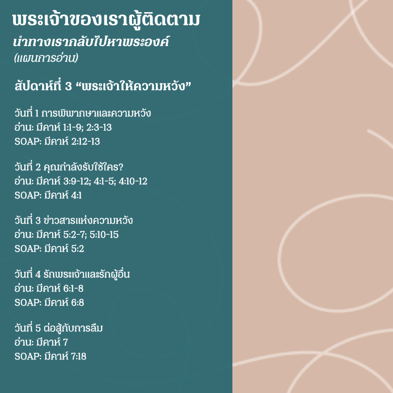เมื่อมองไปรอบ ๆ ในโลกปัจจุบัน เป็นเรื่องง่ายที่เราจะสงสัยว่าเมื่อไหร่ความยุติธรรมจะชนะและความชั่วร้ายจะสิ้นสุดลง พระวจนะของพระเจ้ามอบข่าวสารแห่งความหวัง เราเห็นว่าพระเจ้าทรงควบคุมทุกสิ่งและสามารถไว้วางใจได้ แม้ท่ามกลางบาปและความยากลำบาก พระเจ้าก็ไม่เคยหยุดตามหาเราและนำทางเราให้กลับไปหาพระองค์ เมื่อประชาชนในอิสราเอลและยูดาห์หันหลังให้กับพระเจ้าผู้แสนดีและเต็มไปด้วยความรักของพวกเขา พระเจ้าจึงส่งผู้เผยพระวจนะหรือผู้ส่งสารเพื่อไปเรียกพวกเขาให้กลับมาสู่ความสัมพันธ์กับพระองค์ ข้อความเหล่านี้เราพบได้ในพระธรรมของผู้เผยพระวจนะน้อย ในบทเฝ้าเดี่ยวทั้ง 4 สัปดาห์นี้ เราจะเจาะลึกลงไปในพระธรรมของผู้เผยพระวจนะน้อย เพื่อเห็นการติดตามของพระเจ้าของเราผู้สัตย์ซื่อและยุติธรรม บทเฝ้าเดี่ยวเหล่านี้จะช่วยให้คุณเรียนรู้ว่าชีวิตแห่งการเชื่อฟังนั้นเป็นอย่างไร พระเจ้าผู้ติดตามเรา นำทางเรากลับไปหาพระองค์ จะช่วยให้คุณเดินในความหวังที่ว่า พระเจ้าจะไม่ยอมแพ้และพระองค์มุ่งมั่นที่จะทำให้ทุกสิ่งเป็นสิ่งใหม่