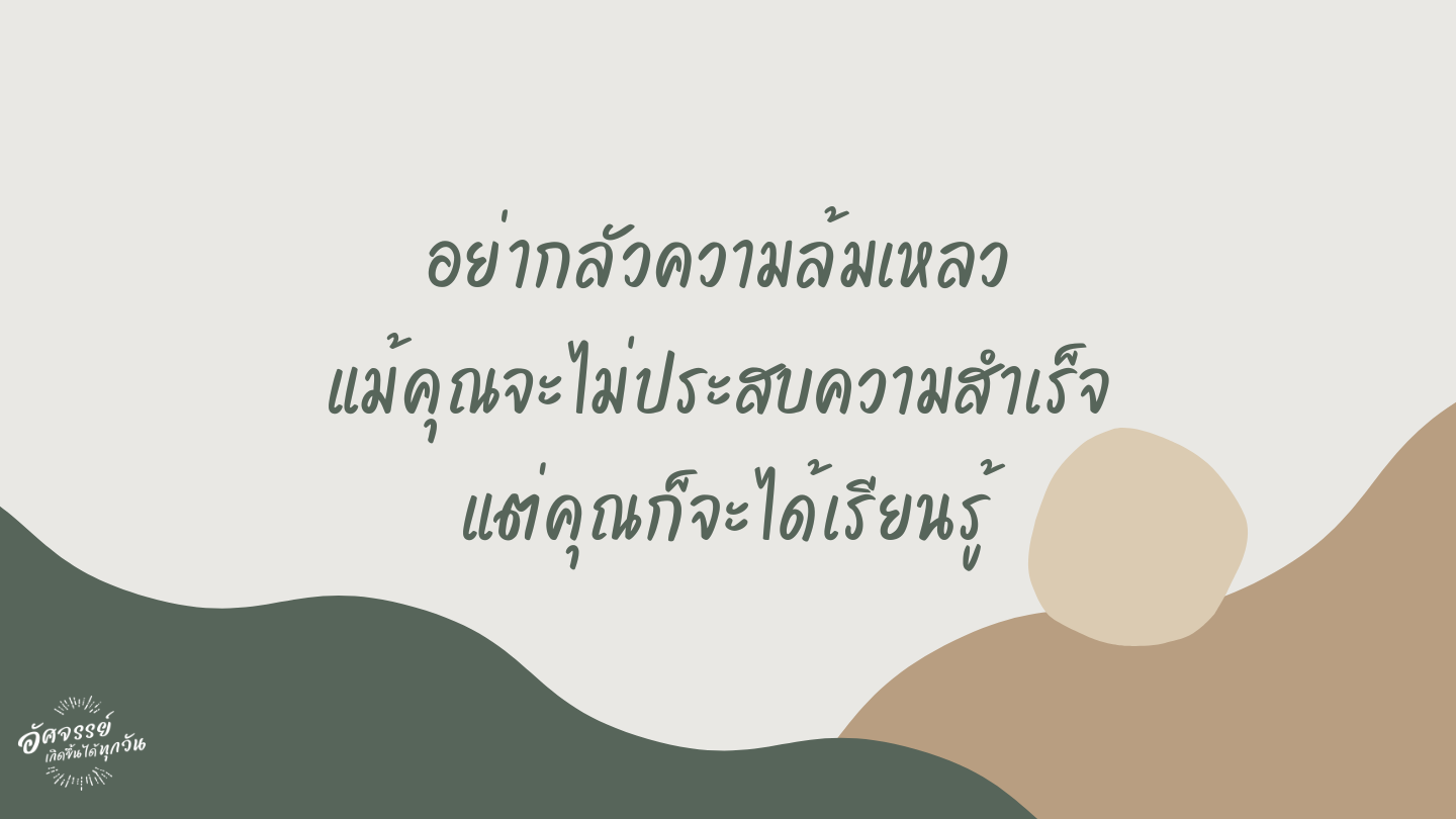 อย่ากลัวความล้มเหลว แม้คุณจะไม่ประสบความสำเร็จ แต่คุณก็จะได้เรียนรู้ จากความผิดพลาดเหล่านั้น และทำให้ดีขึ้นได้ในครั้งต่อไป ความปรารถนาของพระเจ้าคืออยากจะเห็นว่า คุณได้ทำความฝันที่พระองค์ทรงมีสำหรับคุณให้มีชีวิตขึ้นมาได้ ฉันอยากหนุนใจคุณว่า…อย่าล้มเลิกที่จะหวัง จงเริ่มเชื่อ เหมือนที่พระเจ้าบอกไว้ในพระธรรมฮีบรู 11:1 ว่า… “ความเชื่อคือความมั่นใจในสิ่งที่หวังไว้ เป็นความแน่ใจในสิ่งที่มองไม่เห็น” ฮีบรู 11:1