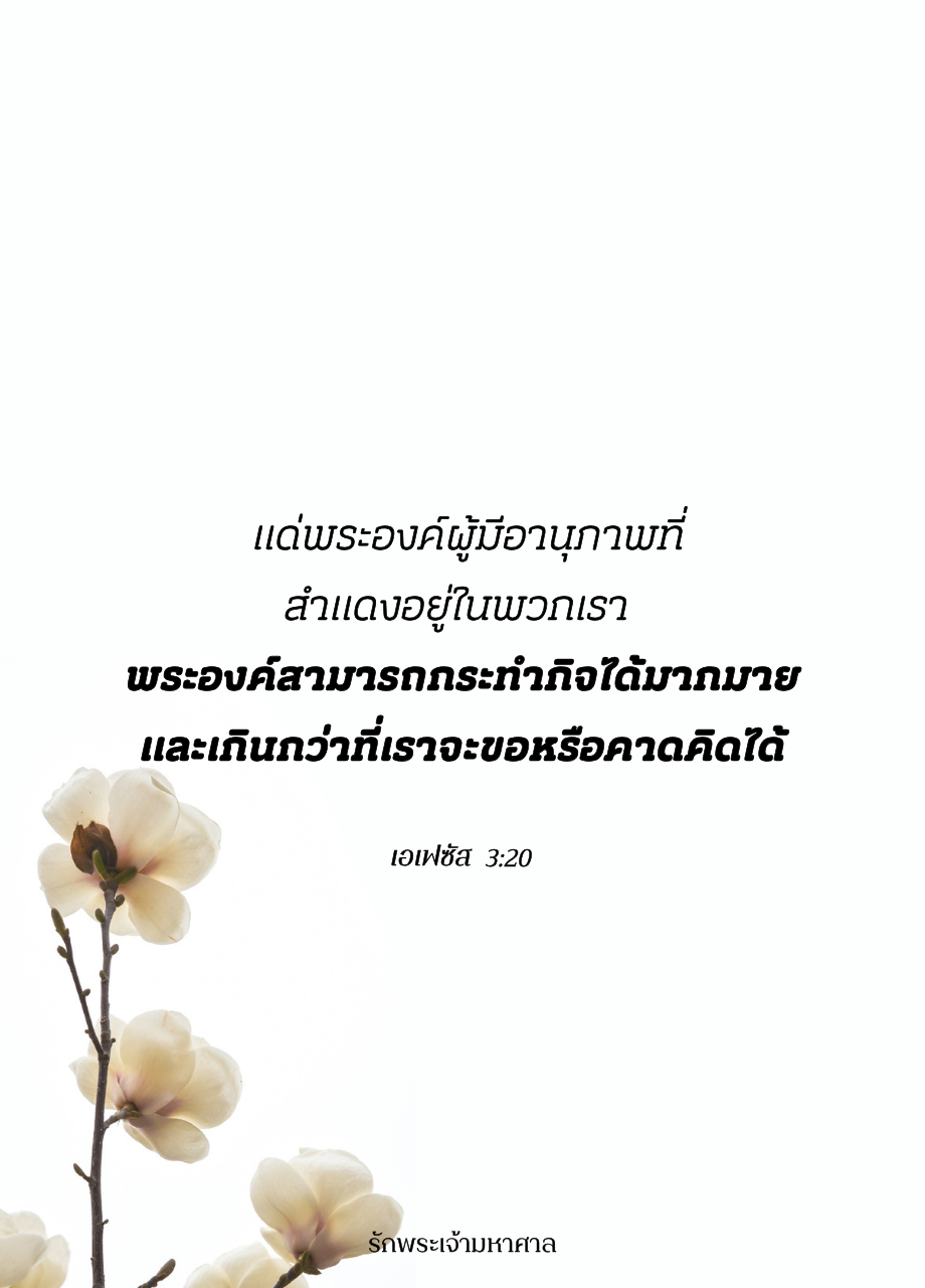 อธิษฐาน พระเจ้า ขอบคุณพระเจ้าสำหรับอำนาจอันไร้ขอบเขตของพระองค์ โปรดช่วยให้ข้าพระองค์เชื่อมั่นในพระองค์ และการทำงานของพระองค์ในด้านที่ข้าพระองค์ลังเลสงสัยในอำนาจของพระองค์ ขอให้ข้าพระองค์ได้เห็นวิธีการที่พระองค์ทำการอยู่รอบตัวข้าพระองค์ อาเมน