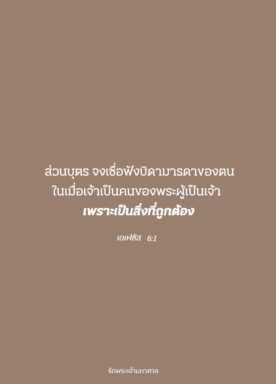 นี่ไม่ได้หมายความว่า พ่อแม่ทุกคนบนโลกนี้จะสมบูรณ์แบบหรือใจดี แม้ว่าพ่อแม่ทุกคนจะเป็นคนบาป แต่เรารู้ว่า พ่อแม่บางคนไม่ได้แสดงความรักและความเอาใจใส่ตามที่ควรจะเป็น เรารู้สึกเสียใจมาก หากนี่เป็นประสบการณ์ของคุณ จงรู้ไว้ว่าลักษณะนิสัยที่พ่อแม่บนโลกของคุณแสดงออกนั้น ตรงกันข้ามกับพระบิดาบนสวรรค์ของคุณโดยสิ้นเชิง พระองค์รักคุณมากและห่วงใยคุณอย่างยิ่ง พระองค์ได้มอบครอบครัวใหม่ให้กับคุณในคริสตจักร และพระองค์ปรารถนาถึงวันที่พระองค์จะได้ใช้เวลาเป็นนิรันดร์กับคุณ