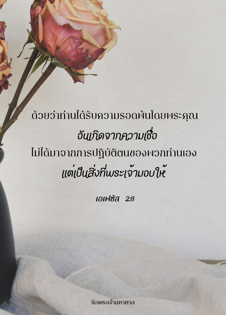 อธิษฐาน พระเยซู ขอบพระคุณพระองค์ที่ความรอดนั้นมาจากพระคุณโดยทางความเชื่อ และข้าพระองค์ไม่จำเป็นต้องใช้ชีวิตในการแสวงหาเพื่อให้ได้มาซึ่งความโปรดปรานและการยอมรับจากพระองค์ อาเมน