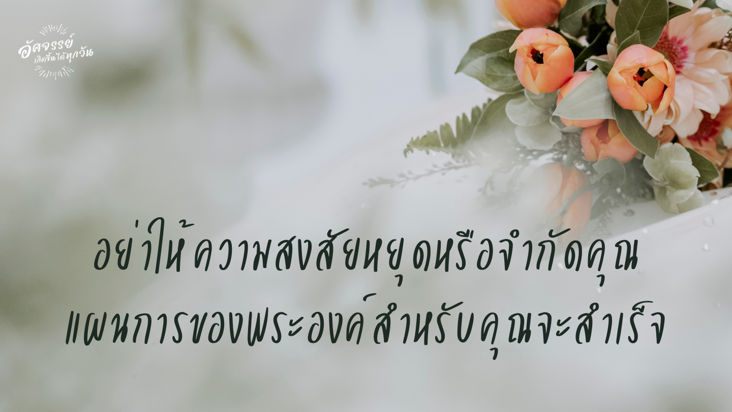 อย่าให้ความสงสัยหยุดคุณ ทำให้คุณช้าลง หรือจำกัดคุณ คุณเป็นลูกที่รักของพระองค์ และแผนการของพระองค์สำหรับคุณจะสำเร็จ