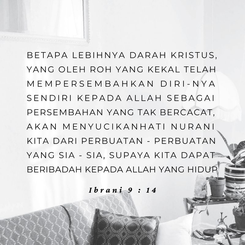 Betapa lebihnya darah Kristus, yang oleh Roh yang kekal telah mempersembahkan diri-Nya sendiri kepada Allah sebagai persembahan yang tak bercacat, akan menyucikan hati nurani kita dari perbuatan-perbuatan yang sia-sia, supaya kita dapat beribadah kepada Allah yang hidup.