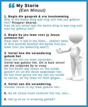 Huiswerk: Jou huiswerk is om na drie Christene te gaan en jou "My Storie" ─ jou Een-Minuut getuienis ─ te deel en te vra hoe hulle dit beleef het.