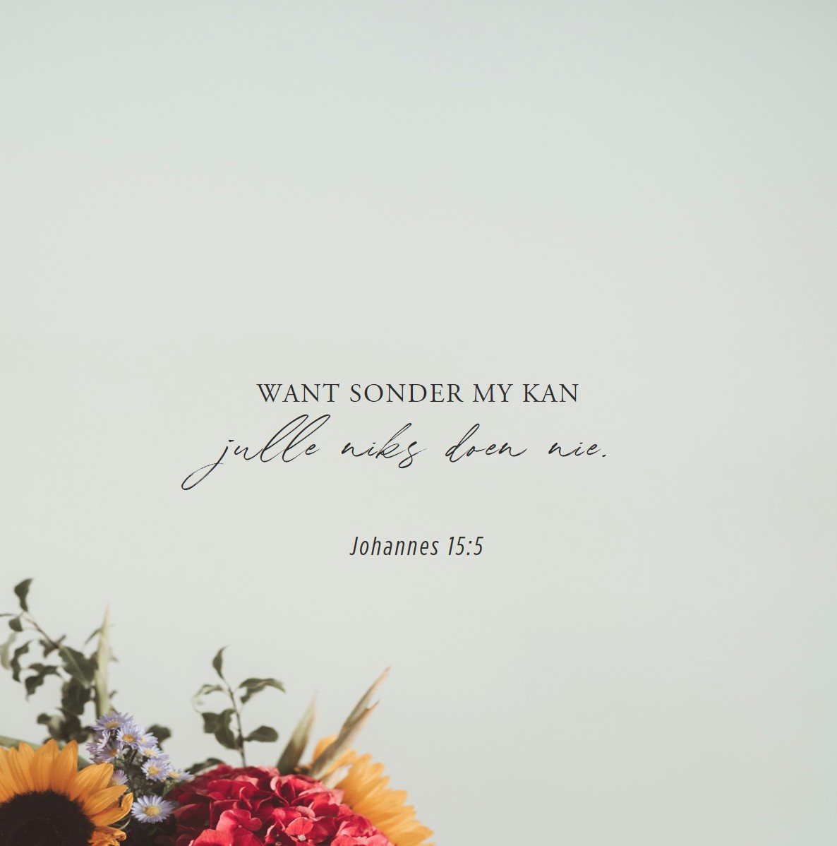 Ek hou van wat Jesus sê: "dra baie vrugte ..." Dit is asof Hy ons sagkens daaraan herinner dat ons lewens bedoel is om oor te loop met geestelike vrugte. Maar hier is die beste deel. Daar word nie van ons verwag om dit in ons eie krag te doen nie. Jy, my liewe vriendin, is heeltemal onbekwaam om hierdie vrugte te laat groei. Dit is 'n taak wat ons saam met Jesus doen.