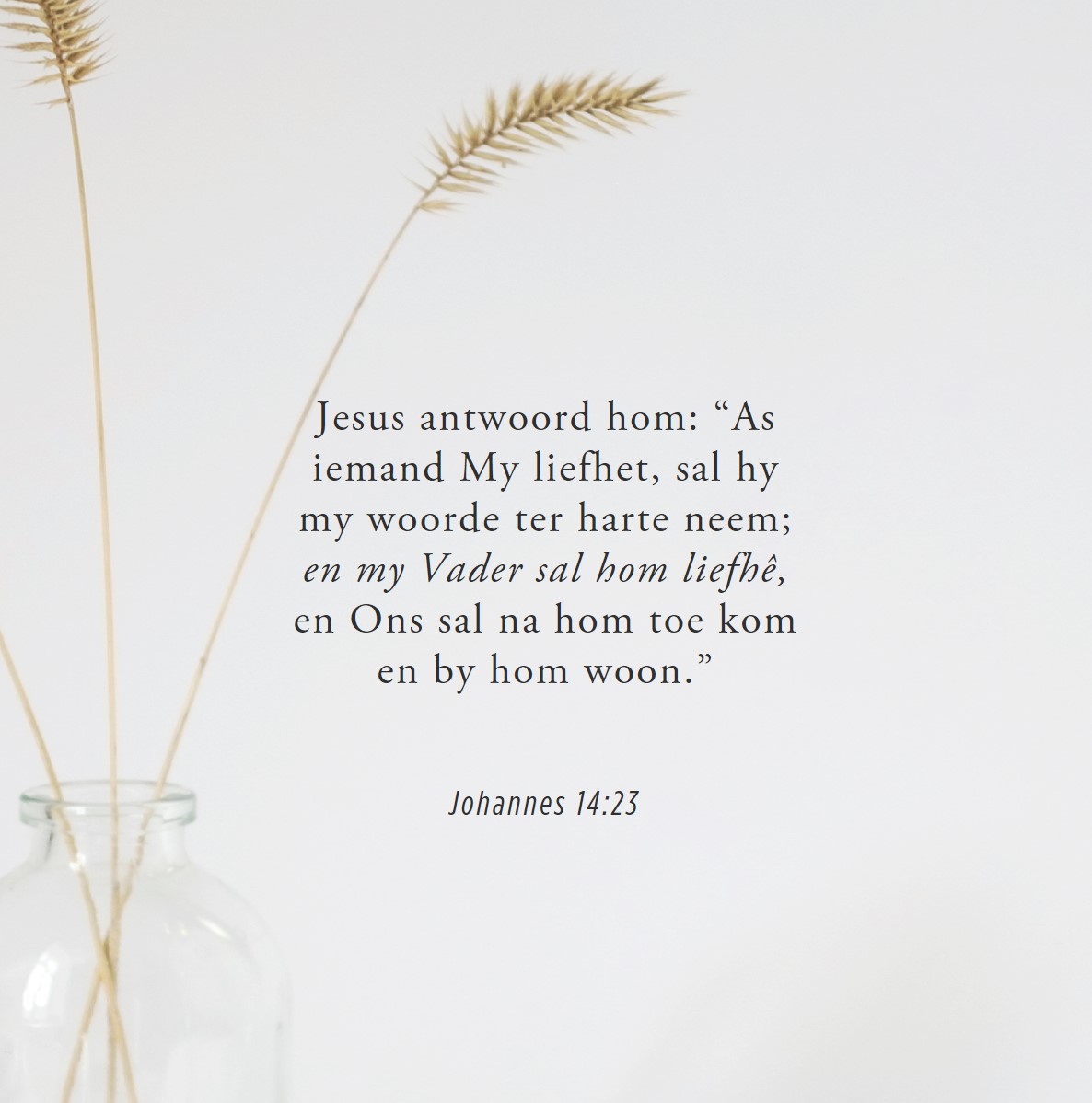 En terwyl God die hele wêreld liefhet, praat Jesus van 'n soort intimiteit en liefde wat net aan God se mense belowe word. Die Vader sal op 'n spesiale manier na diegene kom wat Hom liefhet en gehoorsaam. Hy sal hulle vertroos, beskerm, lei en vir hulle voorsien. Hy sal hulle nooit verlaat nie.