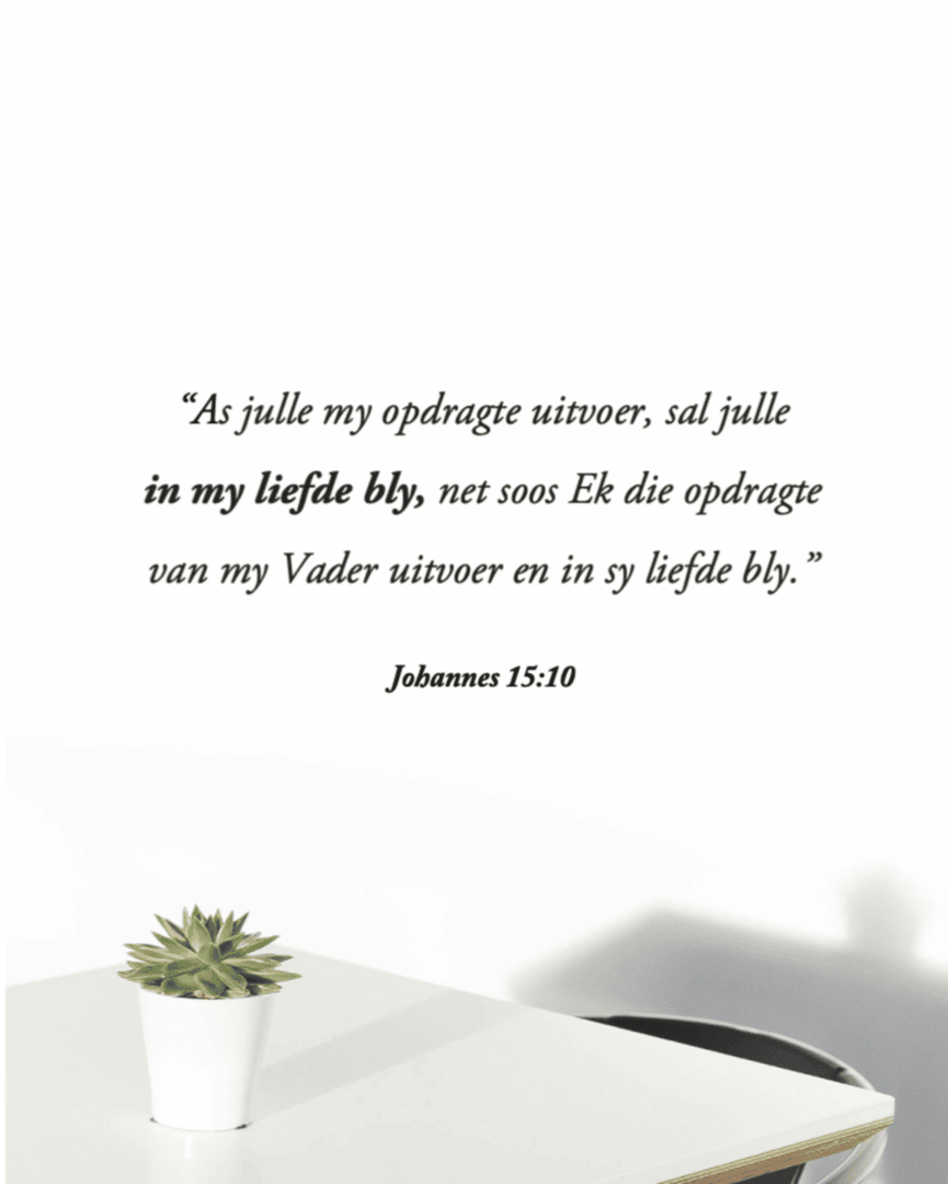 1. In watter areas van jou lewe vind jy dat gehoorsaamheid 'n uitdaging is? Hoe kan jy, deur op Jesus se liefde vir jou te fokus, jou perspektief verander om sy opdragte uit te voer?