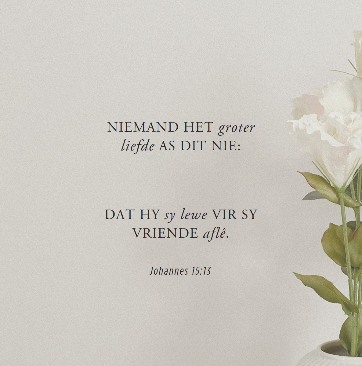 Niemand het groter liefde as dit nie: dat hy sy lewe vir sy vriende aflê. Julle is my vriende as julle doen wat Ek julle beveel.