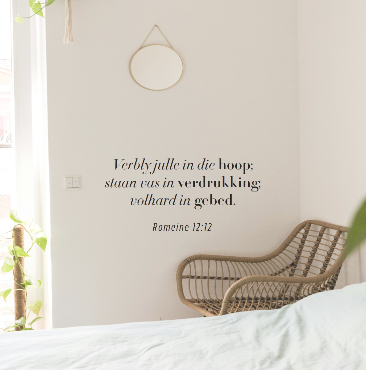 Paulus moedig ons ook aan: "Verbly julle in die hoop; staan vas in verdrukking; volhard in gebed." Wanneer ons in Christus bly, gee Hy ons die krag om bly te wees te midde van moeilike tye, volhardend te wees wanneer ons moeg voel, en aan te hou bid met ‘n hoopvolle hart. Dit is omdat ons gewortel is in ‘n Verlosser wat ons deur alles dra.